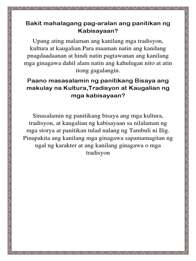 1Upang makilala ang kalinangang Pilipino malaman ang ating minanang yaman ng kaisipan at taglay na katalinihan ng lahing ating pinagmulan. Ito ay mga isyung napapanahon at mainit na pinag-uusapan sa kasalukuyan. Dahil dito ang panitikan ay nagiging mahalagang bahagi ng pag pasa ng ating kultura at tradisyon sa susunod na mga henerasyon.