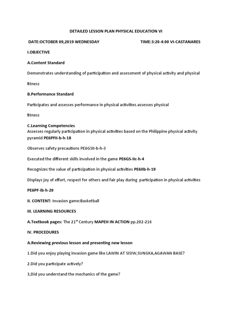 Detailed Lesson Plan Physical Education Vi Oct 09 Lesson Plan Educational Assessment