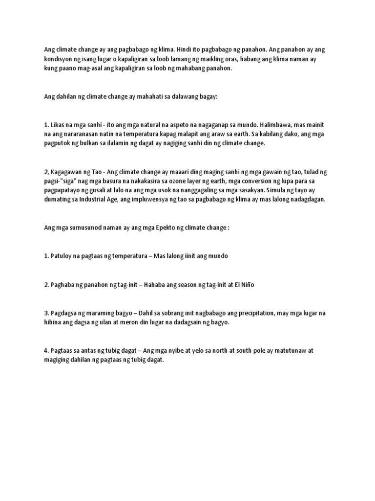 Ano ang dahilan ng climate change. Glass Bottles Plastic Bote Cans o Lata Dyaryo at Karton Sa ganitong paraan makatutulong kana sa kaliksan maari kapang. Climate change ang itinuturing dahilan ni Pangulong Rodrigo Duterte kung kaya nakararanas ng malakas na bagyo at pagbaha ang bansa gaya nang nangyari sa Isabela at Cagayan. Ang climate change ay ang pagbabago ng klima o panahon dahil sa pagtaas ng mg greenhouse gases na nagpapainit sa mundo.