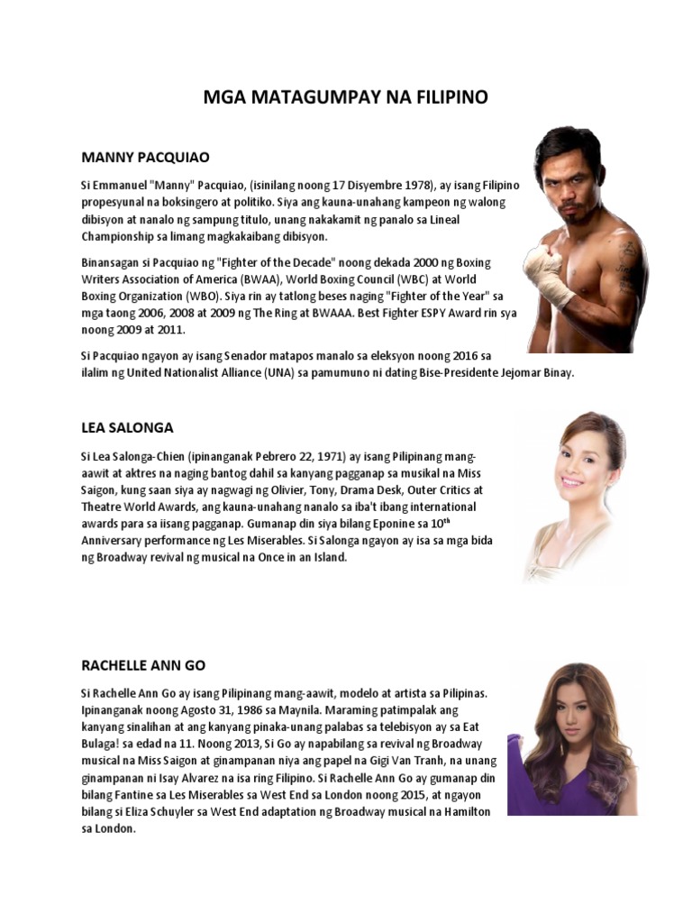 Answers Mga Pilipinong Naging Matagumpay sa IbatIbang LaranganMga KatangianNakamit na TagumpayHalimbawaMasigasig sapagboboksingNaging kampeon saBuong MundoManny Pacquiao12345. Mga pilipinong naging tagumpay sa ibat-ibang larangan lea salonga - larangan ng musika. Halimbawa ng matalinhagang salita at ang kanilang mga kahulugan.