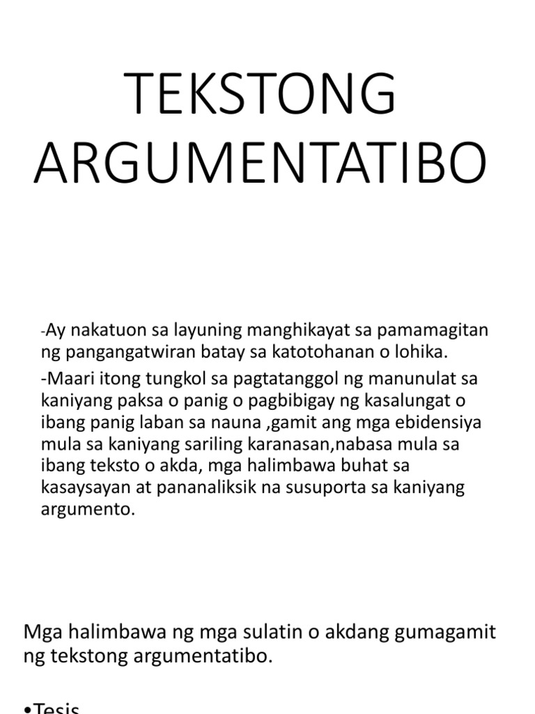 KATANGIAN AT NILALAMAN NG MAHUSAY NA TEKSTONG ARGUMENTATIBO MAIKLI NGUNIT MALAMAN AT MALINAW NA PAGTUKOY SA TESIS SA UNANG TALATA NG TEKSTO MAHALAGA AT NAPAPANAHONG PAKSA Sa unang talata ipinaliliwanag ng manunulat ang konteksto ng paksa sa pamamagitan ng pagtalakay nito sa. Ang tekstong argumentatib ay isang uri ng akdang naglalayong. Halimbawa ang isang tao ay nakapagtapos ng PhD.