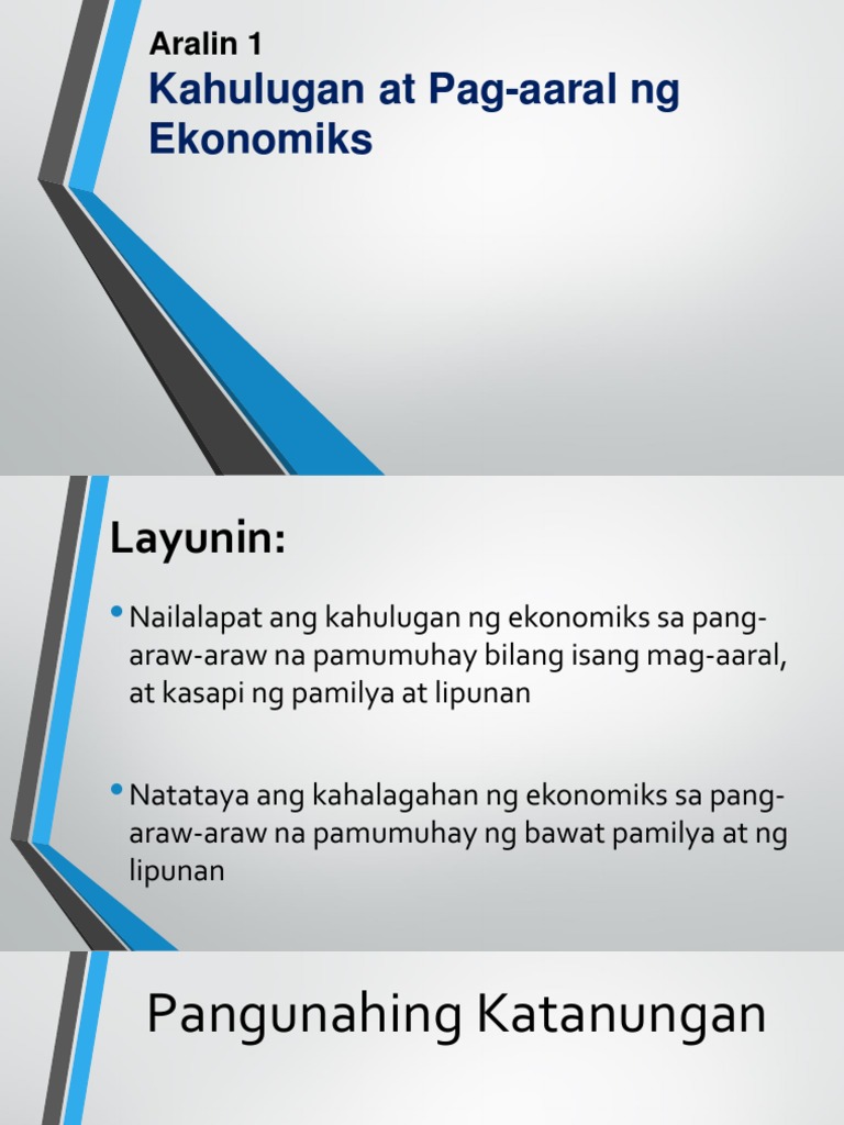 Demand at suplay 3. Bakit mahalaga ang pag-aaral ng ekonomiks. Ang ekonomiya ay nagtuturo ng mga makabagong pamamaraan ng produksyon 4.